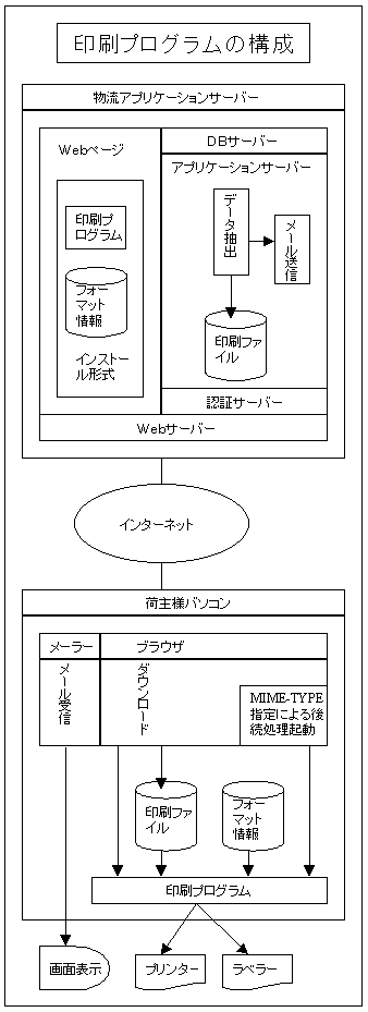 カンガルーマジックIIは物流アプリケーションサーバーにあるプログラムで処理されますが、お客さまのプリンタを制御するためのプログラムとして、お客さまのパソコンに印刷システムをインストールしていただく必要があります。